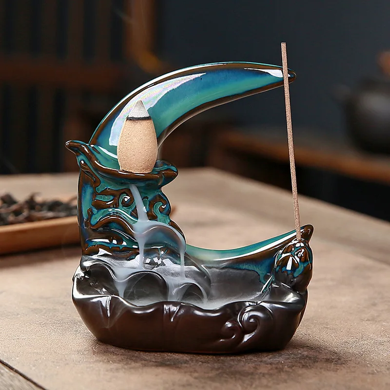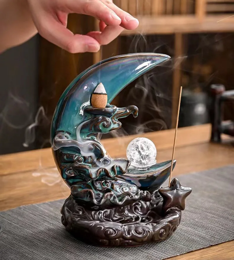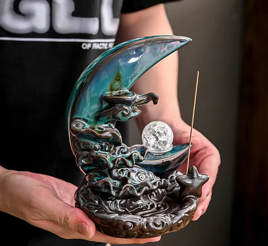 Enhance your home with this large reflow incense burner, combining aesthetic appeal with calming aromatherapy benefits. Designed with a creative moon motif, it serves as both a functional incense plate and an artistic home decoration. Ideal for burning sandalwood or other incense types, the gentle smoke creates a soothing atmosphere perfect for meditation, yoga, or relaxation. Its spacious surface accommodates multiple incense cones or sticks, while the smooth design ensures easy cleaning and maintenance. The elegant Zen-inspired look adds a peaceful and artistic touch to any interior space. Lightweight yet durable, it fits beautifully on desks, shelves, or tables, enhancing your home or office ambiance. Perfect for personal use or as a thoughtful gift for friends and family who enjoy mindful living and spiritual décor.