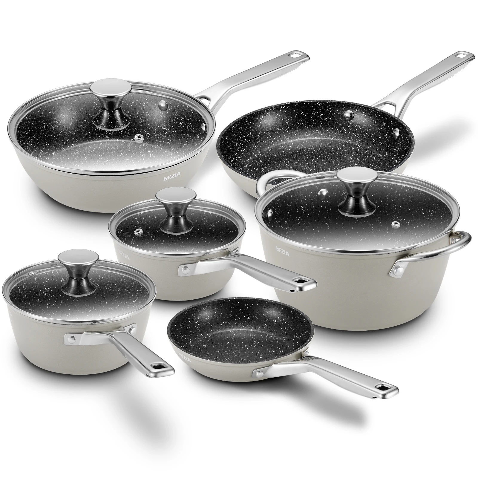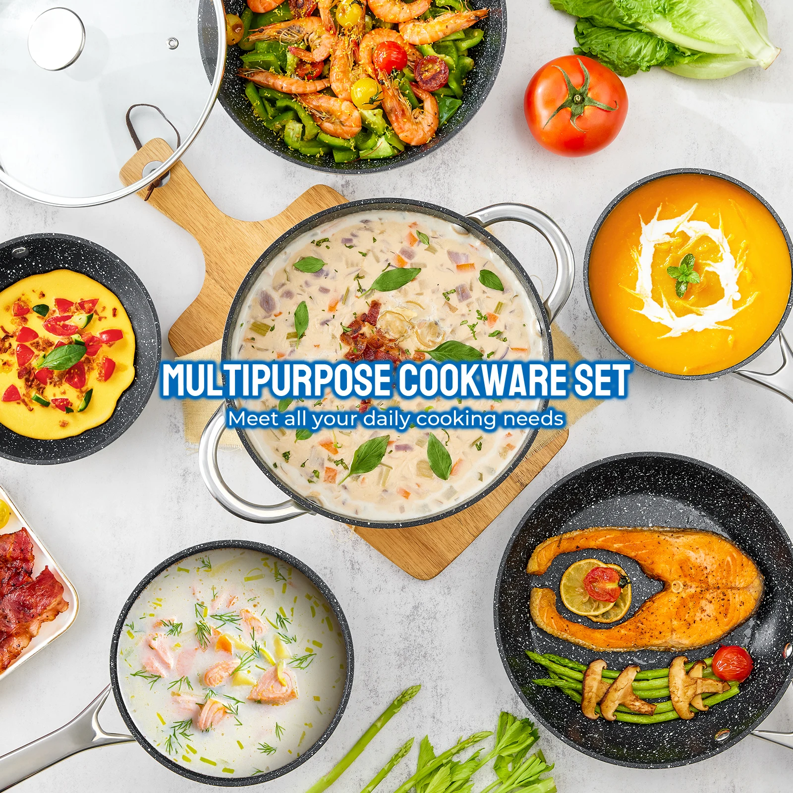 This 10-piece nonstick induction cookware set is designed to deliver effortless cooking performance across all types of stoves. Crafted for induction cooktops while remaining compatible with gas, electric, ceramic, and halogen stoves, it offers true kitchen versatility. The premium nonstick coating ensures easy food release, healthier cooking with less oil, and quick cleanup after meals. Even heat distribution helps prevent hot spots, making it ideal for frying, simmering, sautéing, and everyday meal preparation. The set includes essential pots and pans to handle a wide range of recipes and cooking styles. Durable construction provides long-lasting reliability for daily use. Comfortable handles offer secure grip and control while cooking. Practical, modern, and efficient, this cookware set is a smart upgrade for any home kitchen.