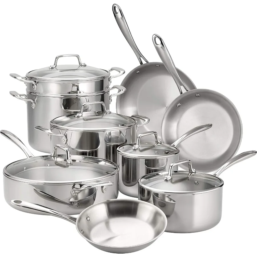 This tri-ply stainless steel cookware set is built for reliable performance and everyday versatility in the kitchen. The multi-layer clad construction ensures fast, even heat distribution, helping prevent hot spots and delivering consistent cooking results. Designed for induction-ready and all stovetop compatibility, this set adapts easily to modern cooking needs. Clear glass lids allow you to monitor food without lifting, helping retain heat and moisture for better flavor. The stainless steel surface is durable, non-reactive, and ideal for healthy cooking without coating wear concerns. Dishwasher-safe construction makes cleanup quick and convenient after every meal. With multiple pots and pans included, this set supports boiling, sautéing, frying, and simmering with ease. Perfect for home cooks and families, it offers a balance of performance, durability, and classic kitchen style.